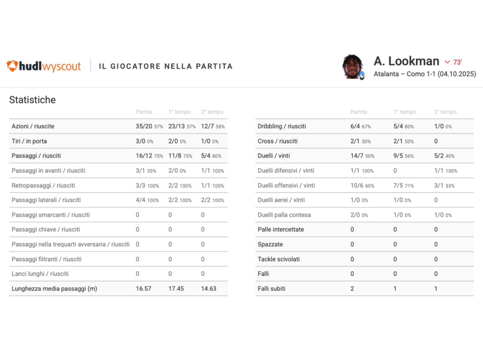L a sosta delle nazionali è arrivata in un momento utile per la Atalanta. Non solo ha consentito ai nerazzurri di svuotare (almeno parzialmente) l’infermeria, ma anche a noi che di Atalanta scriviamo, di fare alcune riflessioni tattiche che vanno oltre il semplice bilancio delle partite. Mentre gli atleti si sono dunque divisi tra chi ha risposto alla chiamata delle nazionali, e chi ha continuato a lavorare a Zingonia, noi di Corner abbiamo scorso immagini e metriche nel tentativo di mettere a fuoco ancor meglio l’Atalanta targata Juric. In questo senso, uno degli spunti più interessanti riguarda l’esperimento tattico utilizzato dal tecnico spalatino nella gara giocata contro il Como, e che ha riguardato la convivenza in attacco di due esterni veloci come Ademola Lookman e Kamaldeen Sulemana. Schierare i due contemporaneamente è stata una scelta dettata in parte dalle contingenze, ma soprattutto da un’intuizione tattica di Ivan. Un’idea che mira a un’Atalanta più verticale, più “freccia” nell’uno contro uno e nella profondità immediata. Una soluzione che genera però un primo nodo tattico da sciogliere, ovvero, come cambia la struttura di gioco quando hai due punte laterali.