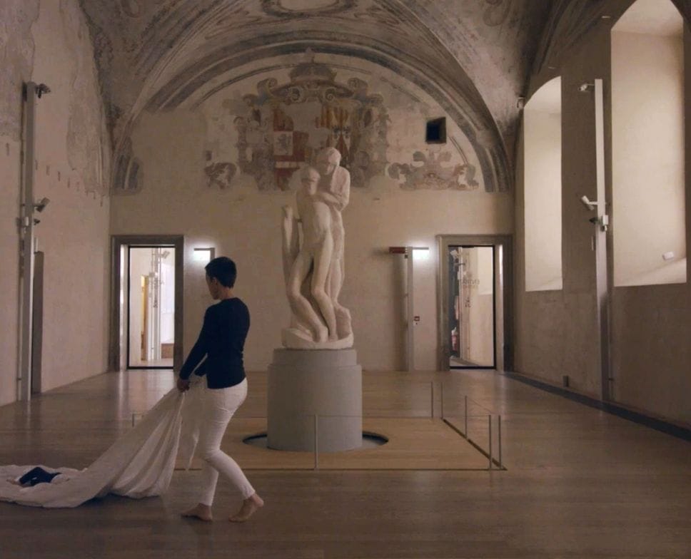 Al piano terra di San Lupo la video installazione «Nascita aperta» nasce dall’esperienza vissuta da Emma con la figlia Ester, in cerca di un dialogo tra i loro gesti quotidiani di cura e la relazione tra i corpi di madre e figlio nella Pietà Rondanini di Michelangelo.