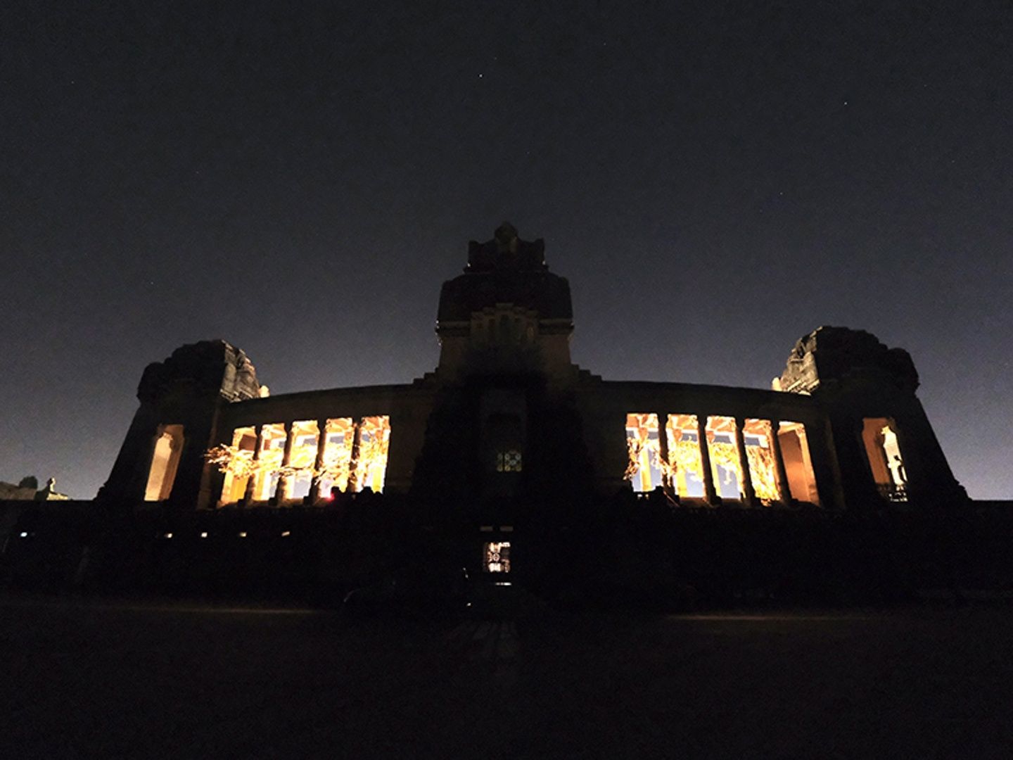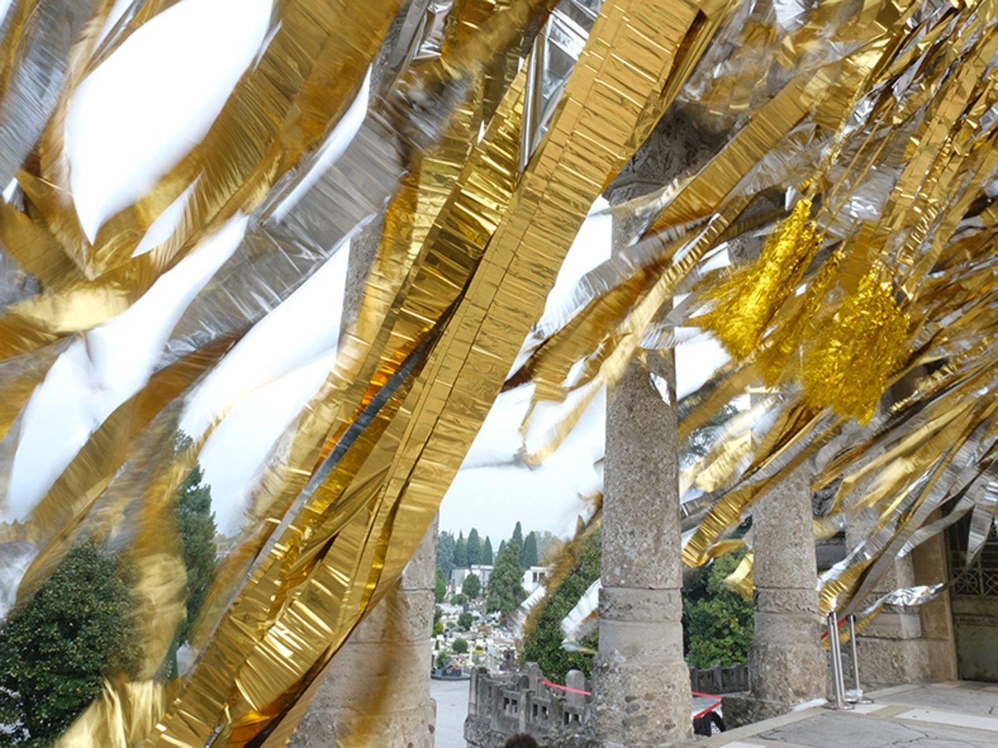 L’artista Daniel González presenta invece Golden Gate, una monumentale installazione effimera che riveste la facciata del Cimitero con superfici dorate in tessuto mylar, materiale simbolo di protezione e rinascita. Le strutture, cucite a mano con il contributo di giovani collaboratori, rifrangono la luce naturale e artificiale creando un effetto vibrante e cangiante. Un portale luminoso tra visibile e invisibile, che invita il visitatore a varcare una soglia simbolica verso la riflessione e la condivisione.