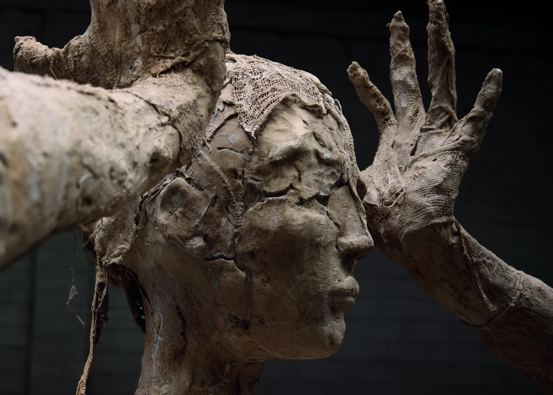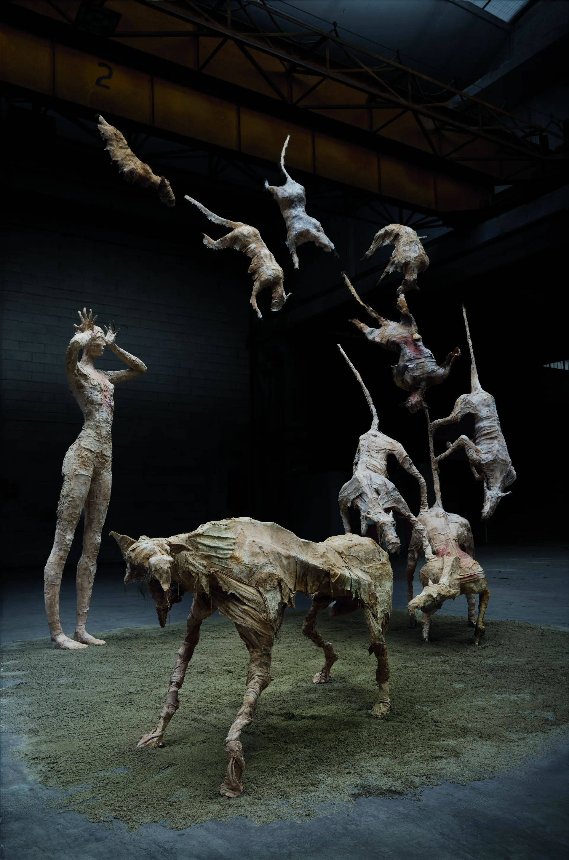 Sabato 4 ottobre, alle 11, al Palazzo Storico del Credito Bergamasco in Porta Nuova, aprirà i battenti «Fragilità riflesse», ardita e monumentale installazione site-specific, realizzata dall’artista per la mostra curata da Angelo Piazzoli e Marcella Cattaneo: ben 36 sculture - realizzate a mano dall’artista in una paziente opera di stratificazione di materiali- metallo, vetroresina, garza, stucco, gesso, pigmenti - si librano nell’aria, calando per oltre undici metri dall’alto cavedio del Palazzo, avvitandosi al livello del Loggiato, fino ad atterrare nel Salone centrale. È la «genesi di un dolore» che dalle pellicce vuote di predatori ancestrali si plasma fino a ricongiungersi a terra, per forza di gravità, con un corpo-carcassa ferito, bendato, scheletrico, ma che ha ancora fame di esistere. L’urlo della figura umana non è di dolore ma, forse, di pietas per il lupo, inaspettato compagno di viaggio nella lotta per la sopravvivenza.