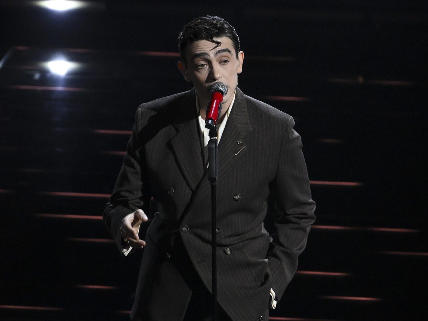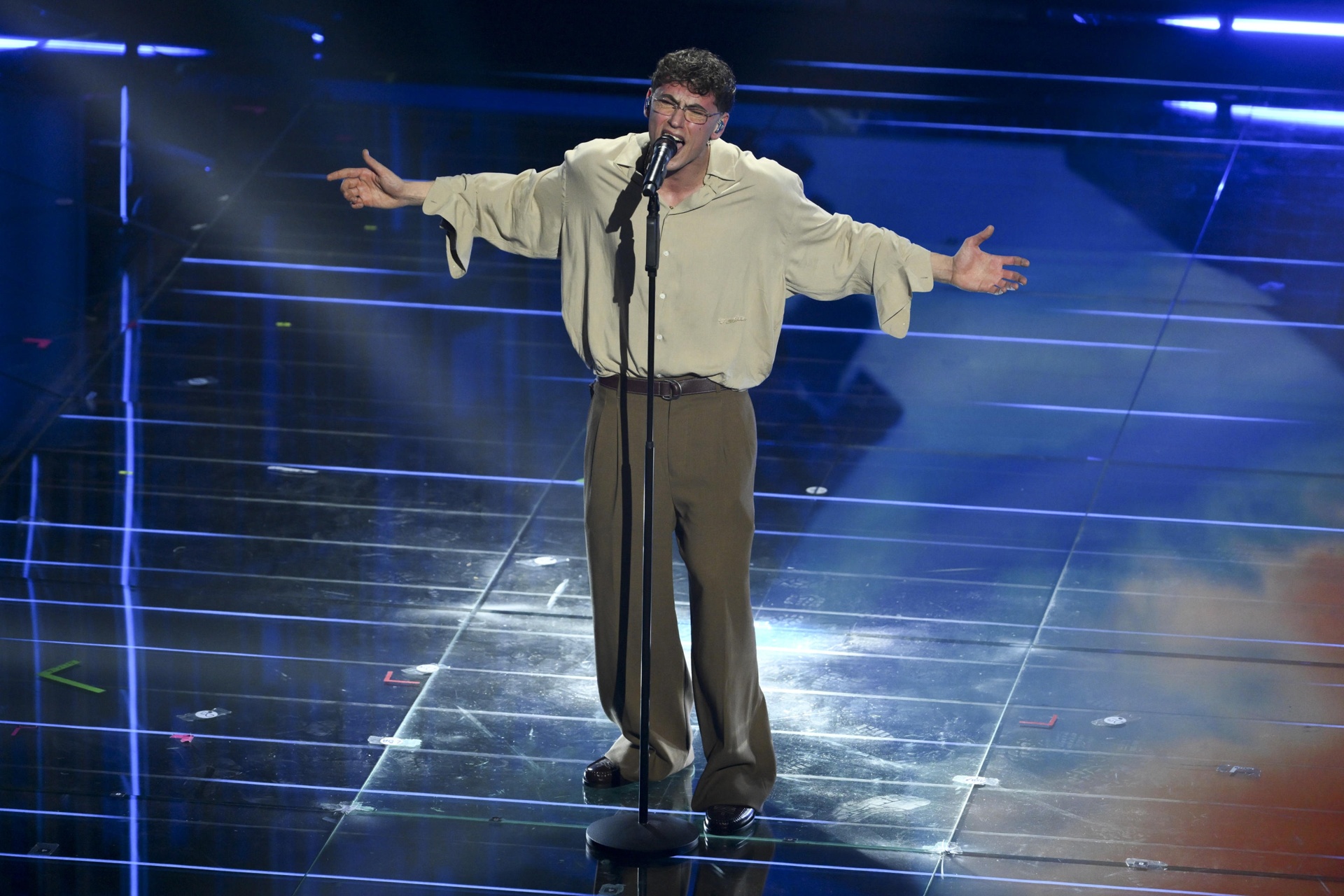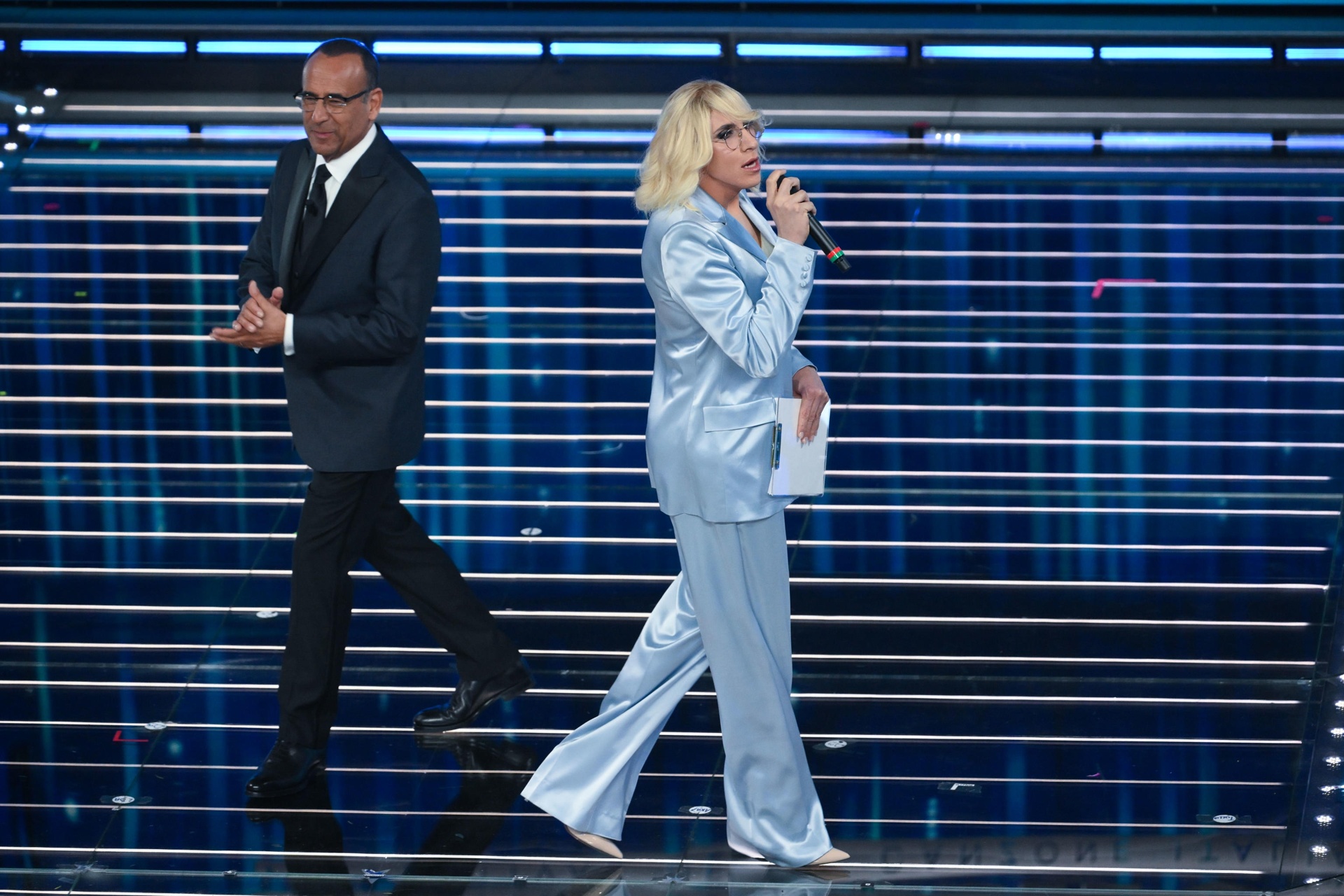 22.12: sul palco il quinto cantante in gara stasera. È il momento di Tredici Pietro con la sua «Uomo che cade». Subito dopo, risate in platea per l’ingresso di Virginia Raffaele e Fabio De Luigi, che danno vita a un siparietto comico mimando i musicisti.