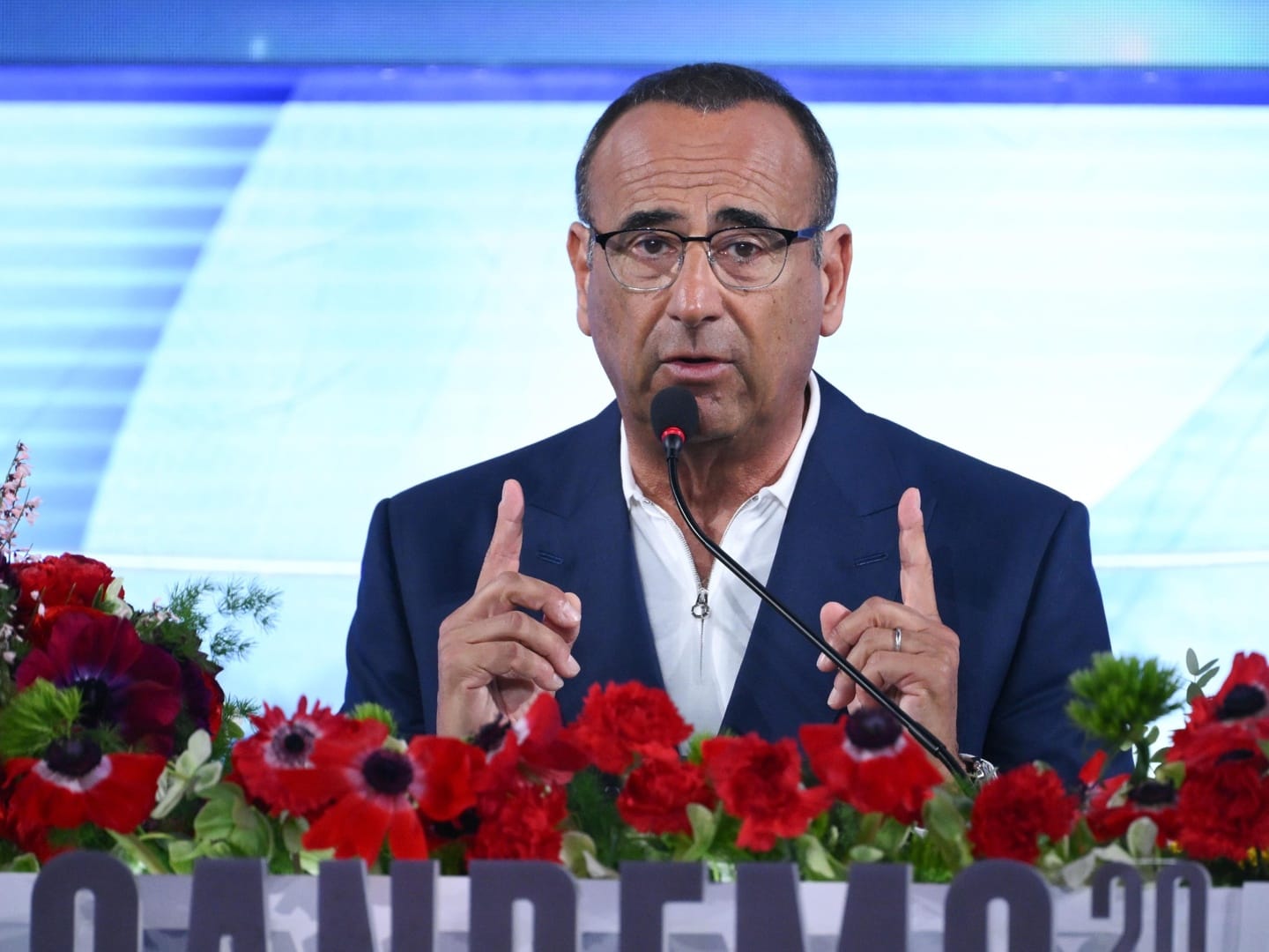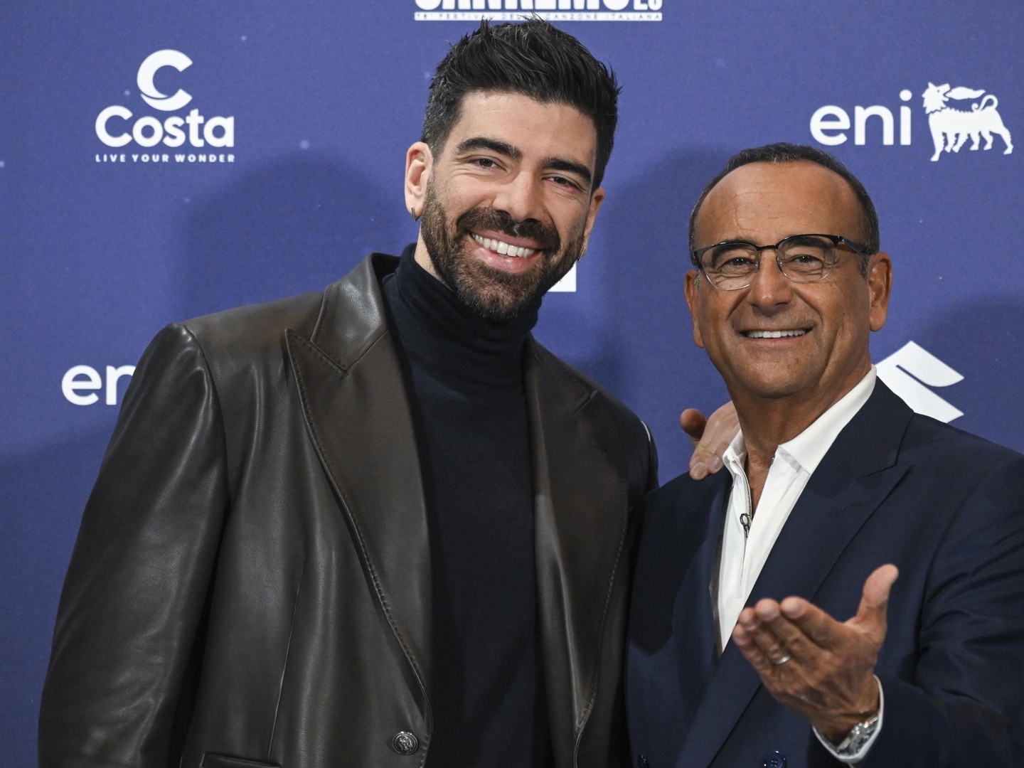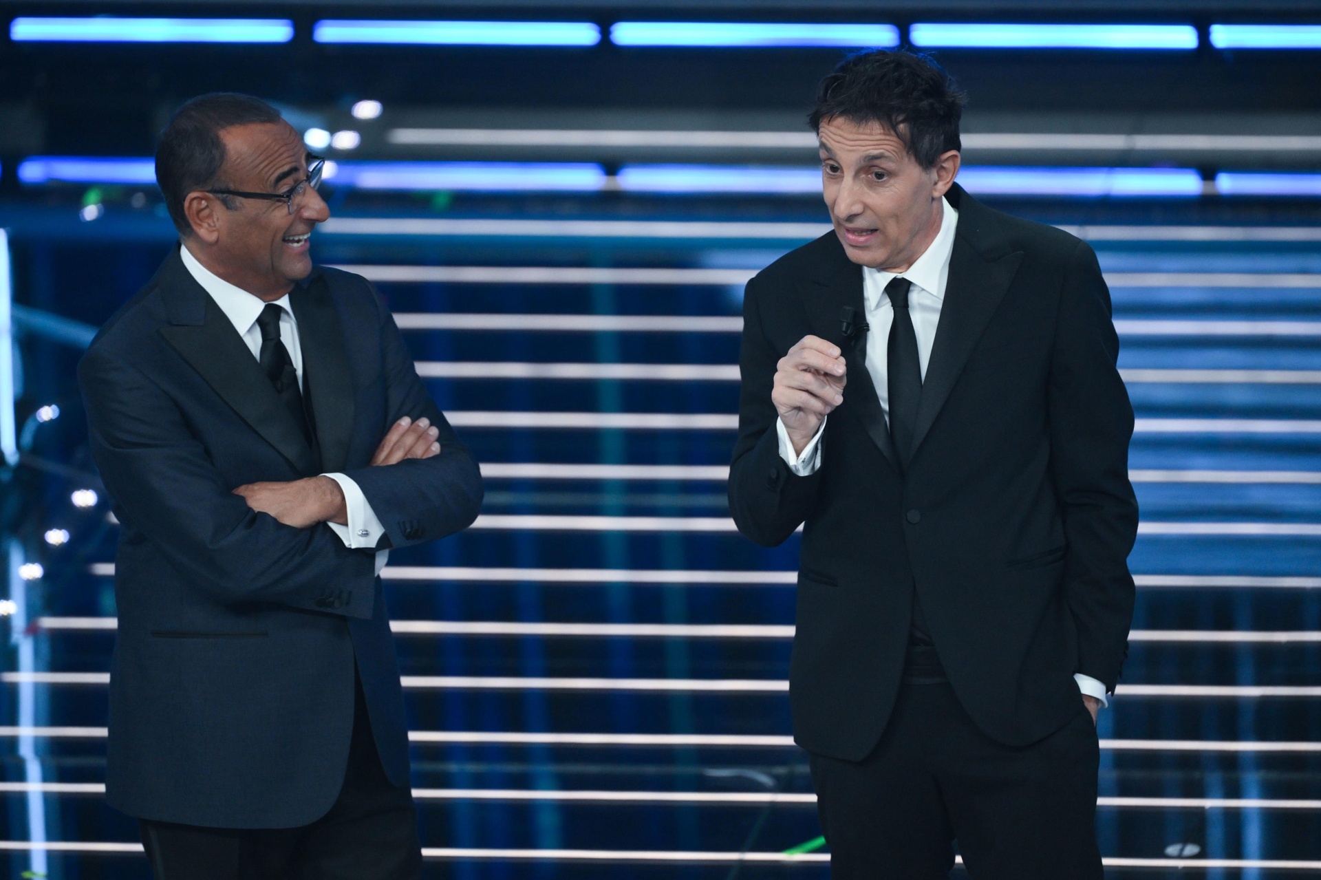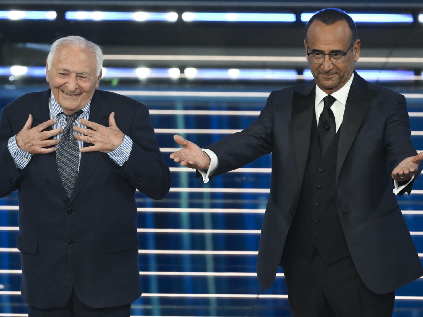 21.35: arriva sul palco il secondo co-conduttore della serata, il comico Ubaldo Pantani, che in abito tricolore imita Lapo Elkann. E s’innesca un divertente scambio di battute con Carlo Conti.