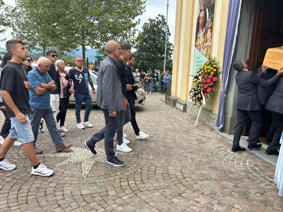Molti i presenti anche all’esterno della piccola chiesa che non li ha contenuti tutti. tretta tra le braccia dei figli, la moglie Ingrid, al seguito del feretro adornato da rose bianche.
