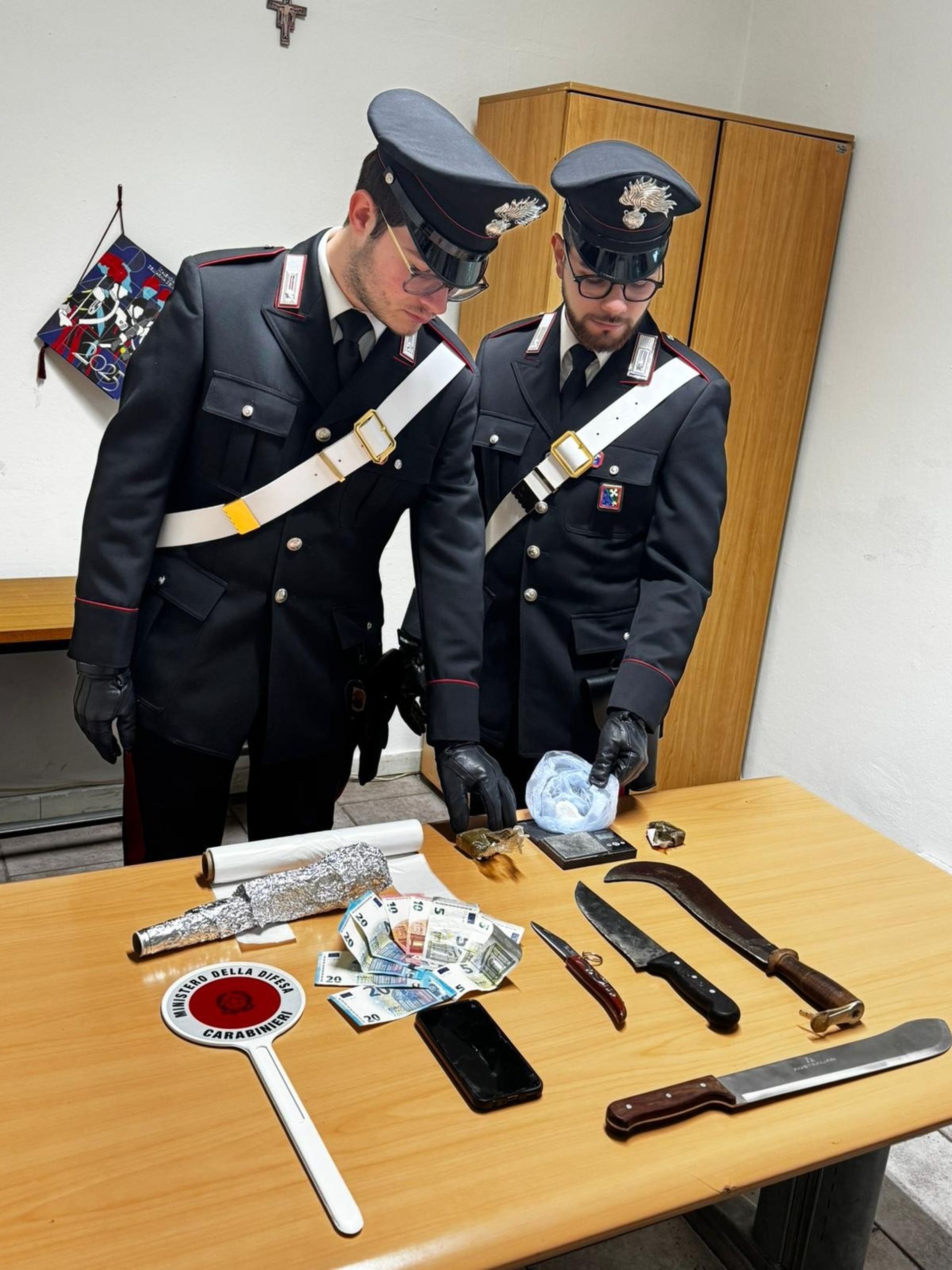 All’interno del locale, caratterizzato da un forte odore di hashish, sono stati sequestrati circa 70 grammi di hashish e 31 grammi di cocaina. I militari hanno inoltre rinvenuto un bilancino di precisione, materiale per il confezionamento, un manoscritto con nomi, cifre e pesi ritenuto riconducibile alla contabilità dello spaccio e 115 euro in contanti in banconote di piccolo taglio.