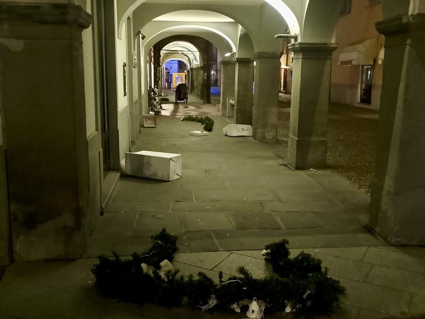 IL CASO. Addobbi natalizi strappati, tavolini e sedie di un bar buttati a terra e sparsi per strada, fioriere e alberelli rovesciati e abbattuti.