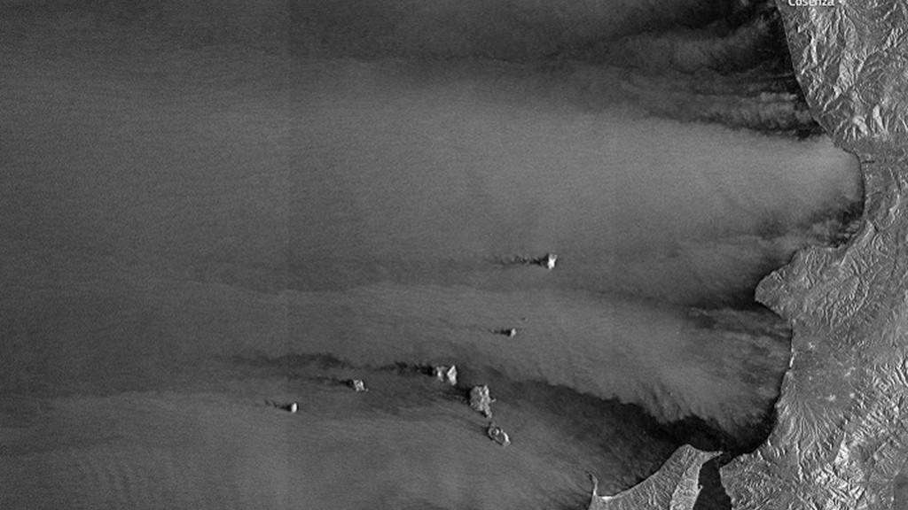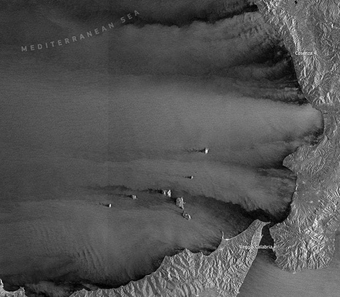 L'immagine mostra una situazione relativamente meno agitata vicino alle coste della Sicilia settentrionale e dell' Italia meridionale peninsulare , parzialmente riparate da una complessa topografia. Al contrario, le aree al largo mostrano una maggiore rugosità superficiale , indicando la presenza di venti di burrasca sostenuti. Intorno alle isole Eolie, le interazioni del vento sono particolarmente dinamiche. Le isole interrompono il flusso, generando scie, turbolenze e zone riparate, tutti elementi chiaramente impressi sulla superficie del mare.