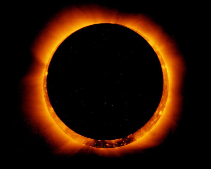 Il fenomeno delle eclissi solari si deve a una straordinaria coincidenza astronomica : la Luna è circa 400 volte più piccola del Sole, ma quest'ultimo si trova in media 400 volte più lontano dalla Terra rispetto al nostro satellite. Ciò fa sì che entrambi gli oggetti appaiano più o meno delle stesse dimensioni nel cielo. La Luna può, quindi, oscurare completamente il Sole dal nostro punto di vista, a meno che non si trovi, come in questo caso, nel punto più distante della sua orbita attorno alla Terra, cosa che la fa apparire un po' più piccola.