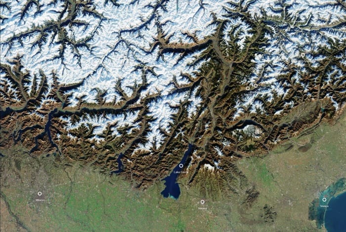 La parte superiore dell’immagine, priva di nuvole , è dominata dalle montagne e dalle valli delle Alpi , dove si trovano la maggior parte delle sedi dei giochi. Partendo da Ovest, sotto le Alpi, è riconoscibile Milano, dove allo Stadio San Siro si tiene la cerimonia di apertura, e più a Est si distingue chiaramente il blu intenso del Lago di Garda , il terzo più grande dell'arco alpino. Ancora a Est c’è Verona, che dopo due settimane di eventi sportivi ospiterà la cerimonia di chiusura dei Giochi Milano-Cortina e la cerimonia di apertura dei Giochi Paralimpici Invernali .