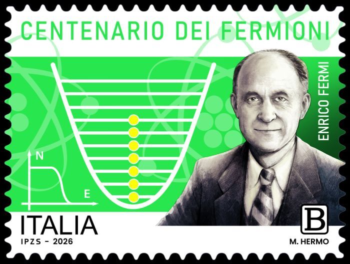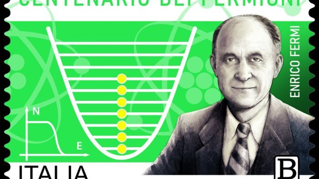 Enrico Fermi accompagnato da simboli della teoria rivoluzionaria che un secolo fa ha segnato la nascita della fisica statistica che governa i componenti fondamentali della materia , i fermioni . Il francobollo appartiene alla serie tematica 'Le eccellenze del patrimonio culturale italiano' ed è stato accompagnato da un annullo speciale avvenuto oggi a Roma, nell'evento organizzato dall'Accademia dei Lincei.