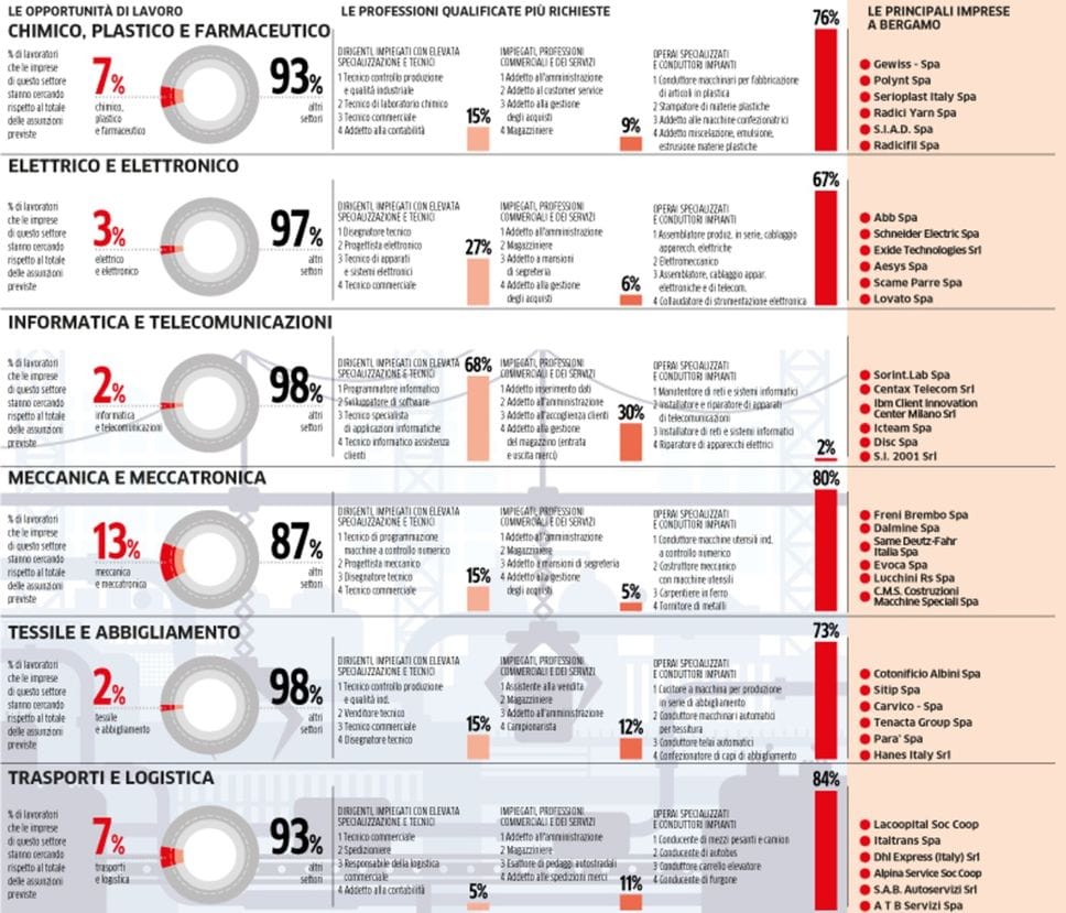 Il mercato del lavoro rivolto ai giovani può quindi ripartire da qui. Da questa mappatura dei profili introvabili oggi e da una fotografia sulle previsioni al 2023, risultato di un lavoro di ricerca e di analisi che Bergamo Sviluppo guidata da Cristiano Arrigoni, l’azienda speciale della Camera di Commercio di Bergamo, ha appena pubblicato: uno strumento per meglio orientare non solo la scelta dei giovani rispetto al lavoro, ma anche come almanacco per individuare il miglior percorso formativo coerente con uno sbocco professionale. Le tabelle nelle pagine danno la reale portata del problema, oltre che suonare come nuovo allarme: manca personale qualificato praticamente in quasi tutti i settori dell’industria del territorio. E sempre più le imprese si contendono i migliori talenti, informatici e meccatronici in testa, visto che ce ne sono anche pochi.
