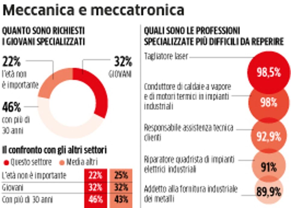 La prima: quasi 7 aziende su dieci preferiscono assumere un ragazzo con diploma tecnico o con una qualifica professionale, vale nel 40,2% delle figure tecniche ricercate o nel 48,7% in alcune professionalità fra cui operai specializzati, conduttori di macchinari o di sistemi automatizzati. Si cerca un laureato solo nell’11% dei casi. Questo in generale. Quando si tratta di indicare «quale qualifica sia realmente necessaria» l’87% degli imprenditori non ha dubbi: la priorità è per il 29%, una su tre, verso un indirizzo meccanico. Ma è la seconda sorpresa ancora più spiazzante: «mancano i candidati giovani a ricoprire questi posti».