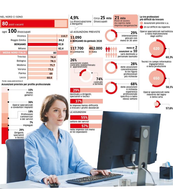 Un gap fra domanda e offerta di competenze digitali, di profili specialistici, di professioni tecnico-commerciali che si allarga sempre più, ma il vuoto cresce anche intorno a profili più generici. Nel mercato del lavoro le due variabili, competenze e posti, fanno sempre più fatica a incontrarsi. La mancata corrispondenza, il mismatch, è un fenomeno da emergenza anche nel territorio bergamasco e sta creando un vuoto importante a imprese e lavoratori: ogni 100 disoccupati ci sono almeno 82 ,8 posti di lavoro nelle aziende che non si riescono a occupare. Un tasso di disoccupazione al 4,9% in Bergamasca significa almeno 25.000 persone in cerca di lavoro. E, fatta la proporzione, vuol dire che in tutta la provincia sono almeno 21mila i posti di lavoro dentro le imprese che non si riescono a coprire per mancanza di profili professionali coerenti con le competenze richieste. Tutti posti che restano scoperti. E intanto aumenta anche la disoccupazione per via di una forza lavoro con competenze in obsolescenza.