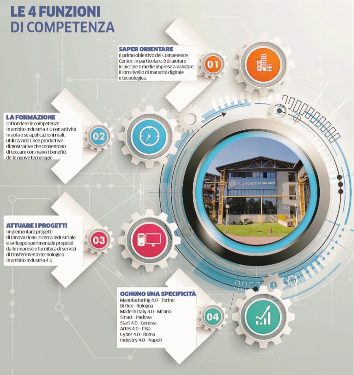 Al via i nuovi centri di orientamento per imprese sulla strada dell’Impresa 4.0. In Italia i Competence Center sono otto: con la sede a Torino, a Milano, a Padova, a Bologna, a Genova, Pisa, Roma e a Napoli. - Show room tecnologici
