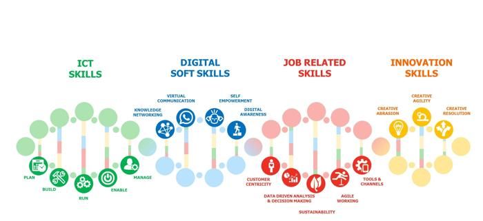 Un nastro, secondo la metafora, sarebbe costituito dalle competenze industriali, mentre l’altro dalle competenze digitali di un’azienda; i legami, i connettori che tengono uniti i due nastri, sarebbero invece proprio quelle competenze trasversali e relazionali che permettono di trasmettere conoscenza e fare da collante tra saperi e figure diverse dentro l’organizzazione.