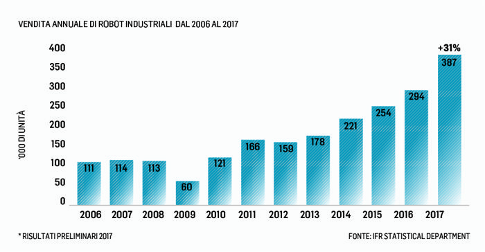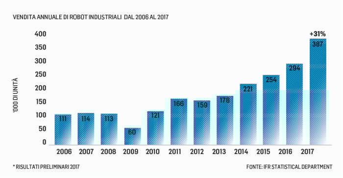 Ancora più rilevante è il fatto che nel 2017 il tasso di crescita relativo ai robot industriali abbia raggiunto il 58% contribuendo decisamente alla crescita della domanda mondiale.