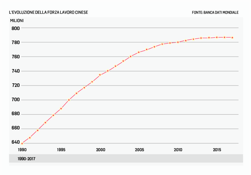 A contribuire alla difficoltà della situazione cinese (e, conseguentemente, a rendere necessario uno stimolo vigoroso per la crescita) vi è la questione demografica. Anche a causa degli stringenti controlli sulle nascite imposti negli ultimi 30 anni la popolazione sta infatti invecchiando rapidamente. Tanto rapidamente, secondo alcuni analisti (tra cui Bloomberg) da prevedere un deciso declino numerico della forza lavoro cinese già a partire dal 2018. Per la prima volta in 50 anni. Previsione in realtà confermata ancor prima di iniziare, se si pensa che già nel 2017 i dati della Banca Mondiale sottolineano come la forza lavoro sia passata da poco più di 787 milioni di persone a 786 milioni e 738 mila persone. Evidenziando, pertanto, un calo, seppure ancora molto limitato in relazione al numero enorme della forza lavoro in attività. Questo fenomeno, chiaramente, contribuirà all’ulteriore aumento del costo del lavoro, già in costante crescita, producendo un’accelerazione del processo qui descritto.