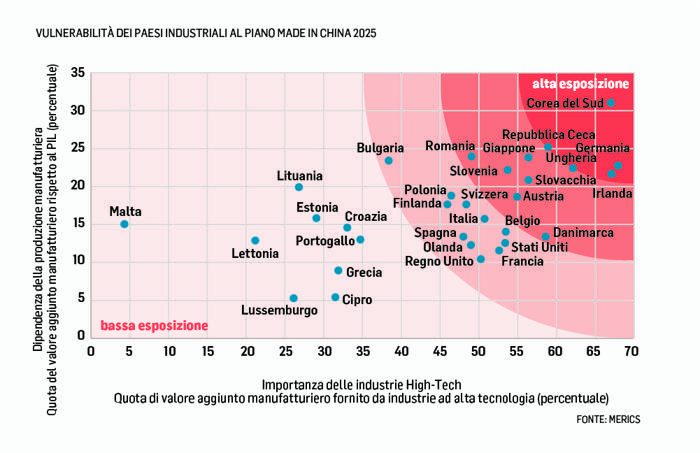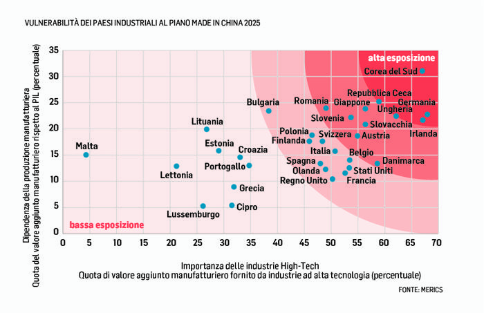 I più esposti dalla crescita cinese in questi settori sono i paesi che si ritrovano nell’angolo alto a destra del grafico, mentre nell’angolo diametralmente opposto troviamo quelli meno influenzati dal piano Made in China 2025. Come vediamo, l’Italia rientra nella zona di esposizione, anche se non estrema (come è, invece, il caso della Corea del Sud). È fondamentale, però, sottolineare il doppio significato di questo grafico. Il fatto che il Pil Italiano sia meno vulnerabile da una forte crescita cinese in questi settori può portare a credere che ci si trovi in una situazione “meno a rischio” rispetto ad altri e che, pertanto, la situazione del paese sia comparativamente migliore di quella di altri. In linea generica, teorica e superficiale, questo potrebbe essere vero. Allo stesso tempo, però, il grafico sottolinea implicitamente quali sono i paesi più avanzati nei comparti ad alto contenuto tecnologico, visto che indica quali paesi hanno una percentuale elevata del proprio Pil derivante da quei settori che hanno dei volumi economici intrinsecamente importanti. Quindi il grafico ci fa capire che, se da un lato è vero che alcuni comparti sono “parzialmente a salvo” da un’aggressione cinese, l’economia italiana è sottosviluppata per quanto riguarda i settori che coinvolgono un grande impiego di alta tecnologia.