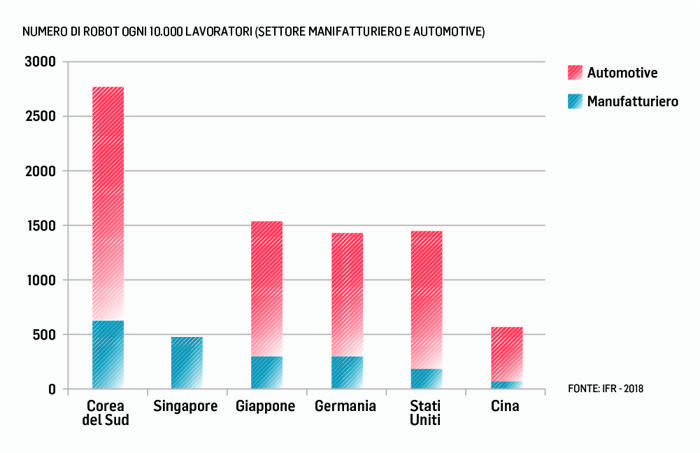 Anche per questo, e contrariamente a quanto la vulgata popolare tende a trasmettere, la produttività cinese è molto bassa rispetto a quella dei paesi più avanzati e, forse sorprendentemente per alcuni, anche rispetto a quella dei paesi in via di sviluppo, come la Malesia. Germania, Corea del Sud e Usa, al contrario, fanno un uso intensivo di linee di produzione e gestione di processo basate su It e macchinari automatizzati. L’Italia, secondo i dati Ifr, ha alcuni settori più avanzati rispetto ad altri e, in generale, si trova al settimo posto a livello internazionale per il numero di robot utilizzati ogni diecimila lavoratori anche se, purtroppo, la produttività italiana è oggi l’ultima del G20. Un risultato pessimo se si va ad osservare la serie storica e, in particolare, se si considera dove era il bel paese trenta anni fa.