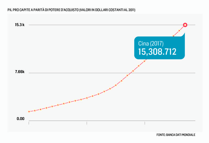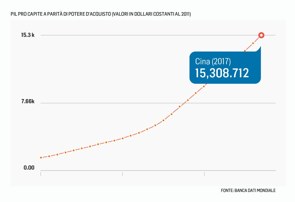 I paesi “poveri” (in via di sviluppo) tendono a crescere più velocemente di quelli “ricchi”, principalmente perché imitare è più facile (e veloce) che inventare. Questo è assodato. I dati della Banca Mondiale, utilizzati anche in questa analisi, posizionano la Cina nella fascia alta delle economie a reddito medio. Questo significa che si trova oggi proprio nella fase più pericolosa della crescita. Secondo molteplici studi (tra cui, forse, il più rilevante alla nostra trattazione è quello prodotto da Barry Eichengreen ed intitolato “Escaping the middle income trap” ossia, “Fuggire dalla trappola del reddito medio”, scarica il pdf) si è scoperto che, dopo aver esaminato numerose economie a reddito medio, quelle in veloce crescita tendono a decelerare in maniera significativa quando raggiungono un Pil pro capite intorno a 16.000 dollari. Se andiamo ad analizzare i dati dei redditi pro capite cinesi in Ppp (parità di potere di acquisto, o, in inglese, purchasing power parity – un indice che consente di confrontare i livelli dei prezzi tra località diverse, appartenenti ad una stessa area valutaria o ad aree valutarie diverse. Nel nostro caso, quello di aree valutarie diverse, si introduce anche una relazione tra i prezzi ed il tasso di cambio) il Pil pro capite è nel 2017 a 15.308.712 dollari.