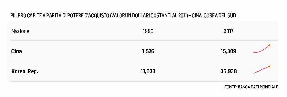 L’economia cinese è quindi alla ricerca di uno strumento che le permetta di superare le colonne d’ercole della crescita economica. Percorso estremamente difficile e che ha condannato molti paesi nel corso della storia. Alcuni, come la Corea del Sud, sono però riusciti a saltare questa trappola, portando il proprio Pil pro capite da 11.633 dollari nel 1990 fino a 35.938 dollari nel 2017.