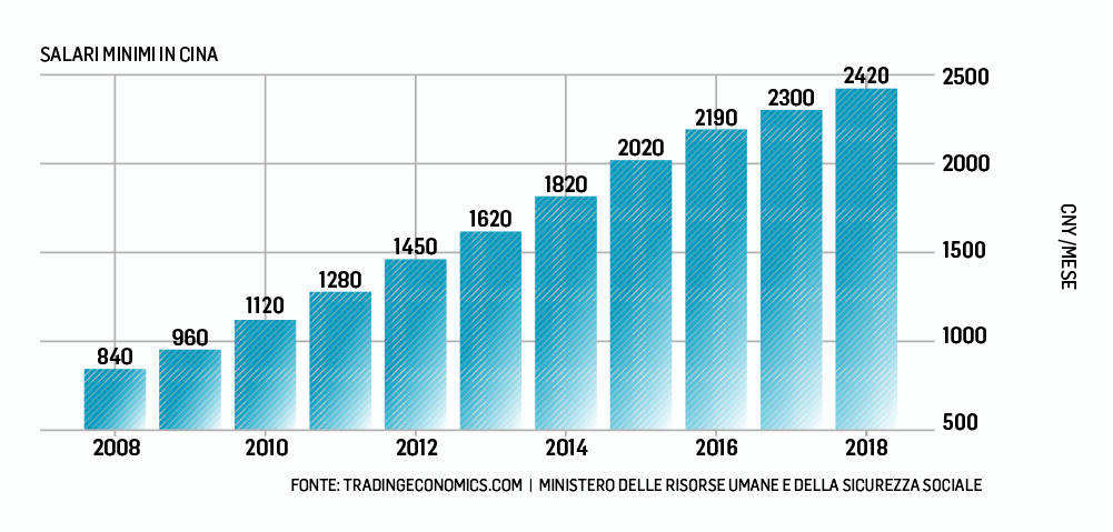 Senza alcun cambiamento alla struttura produttiva (e, con ogni probabilità, senza futuri cambiamenti anche alla sua struttura di mercato che al momento non presenta caratteristiche di libertà economica paragonabili a quelle delle economie più sviluppate) il paese rimarrà incastrato tra due forze che finiranno per schiacciarlo. La sviluppo di un paese, infatti, quando osservato nell’ottica internazionale, non può essere statico. O vi è crescita o vi è decrescita. Perfino la staticità apparente di una stagnazione è, di fatto, una decrescita (o crescita) quando posta in relazione ai risultati ottenuti dai concorrenti. Pertanto, questa crescita (o descrescita) si trova a dover affrontare la forza esercitata dai paesi industriali, più sviluppati, con una maggior produttività e che puntano a mantenere (o meglio dire, aumentare) il gap tecnologico creato in secoli di sviluppo; dall’altro, quella sviluppata dai paesi in via di sviluppo che possono contare, per esempio, su un costo del lavoro più basso rispetto a quello cinese che, come si può notare dal grafico qui sotto, cresce a ritmi molto sostenuti.