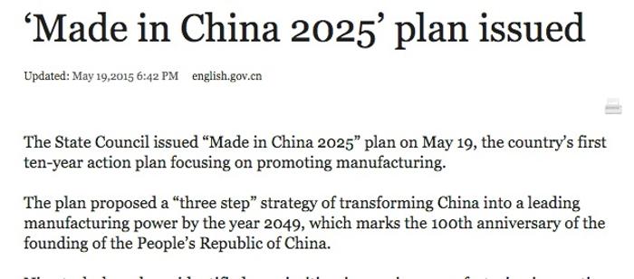 Come rilevato da più parti, ivi incluso dal piano cinese stesso che lo ripete insistentemente, il Made in China 2025 vuol fare diventare il dragone una superpotenza produttiva assoluta. È scritto, infatti, fin dalle prime righe del comunicato stampa cinese (anche nella sua versione inglese, che troviamo qui sotto in uno screenshot) . Sempre dallo stesso comunicato stampa risulta altresì chiaro, oltre ogni ragionevole dubbio, come il piano decennale sia solo un primo passo di un piano che si svilupperà su più livelli fino al 2049, anno del centenario della fondazione della Repubblica Popolare Cinese.