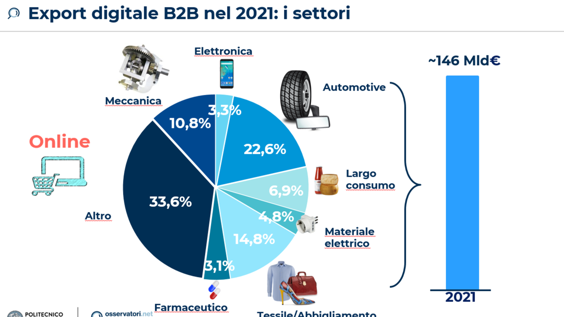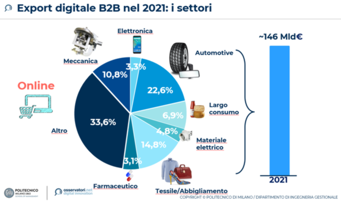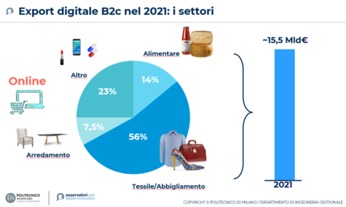 Vale 33 miliardi di euro in termini di export digitale, il 22,6% dell’export totale (online più offline), con una crescita quasi doppia rispetto a quella dell’export complessivo (+40% rispetto al 22,6% dell’export totale).Seguono il tessile e l’abbigliamento (il 14,8%), la meccanica (10,8%), il largo consumo (6,9%), il materiale elettrico (4,8%) e l’elettronica (3,3%). Si contrae, invece, il settore farmaceutico, oggi tornato a un 3,1% del mercato dopo un’esplosione nel 2020 con un +66% (nel 2021 è tornato al 23%, ma di ben 1 miliardo di euro ancora superiore al periodo pre-Covid).