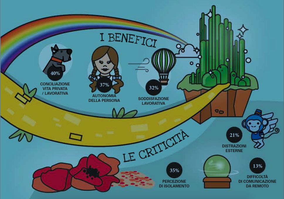 Secondo le imprese, grandi e piccole, ma sentendo anche gli enti della pubblica amministrazione, i principali benefici riscontrati dall’adozione dello smart working sono il miglioramento dell’equilibrio fra vita professionale e privata (46%) e la crescita della motivazione e del coinvolgimento dei dipendenti (35%). Ma la gestione degli smart worker presenta secondo i manager anche alcune criticità, in particolare le difficoltà nel gestire le urgenze (per il 34% dei responsabili), nell’utilizzare le tecnologie (32%) e nel pianificare le attività (26%), anche se il 46% dei manager dichiara di non aver riscontrato alcuna criticità. Se si interrogano gli smart worker, invece, la prima difficoltà a emergere è la percezione di isolamento (35%), poi le distrazioni esterne (21%), i problemi di comunicazione e collaborazione virtuale (11%) e la barriera tecnologica (11%).
