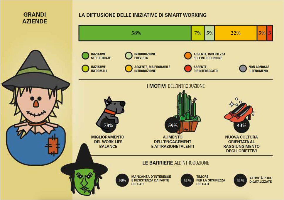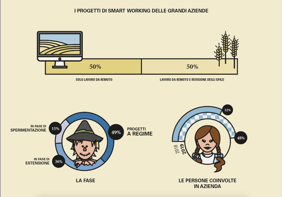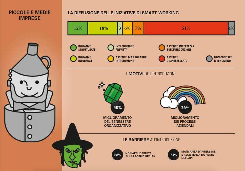 Novità – con sorpresa preoccupante - anche nelle piccole e medie imprese: c’è un aumento della diffusione dello smart working e i progetti strutturati passano dall’8% al 12% attuale, quelli informali dal 16% al 18%. Aumenta di contro la percentuale di imprese disinteressate al tema, dal 38% a oltre la metà (51%).