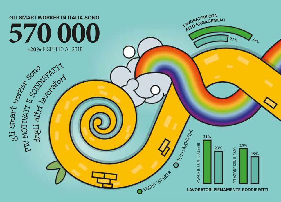 L’ultima fotografia racconta che se solo un terzo dei dipendenti in Italia lavorasse secondo un progetto di smart working, ogni giorno ci sarebbero almeno 2,8 milioni di lavoratori che potrebbero usufruire di ampia flessibilità negli orari di lavoro, di un’autonomia nella scelta del luogo da dove lavorare, di disporre di strumenti digitali e tecnologici per garantire la propria prestazione professionale: tutto questo senza nessuna conseguenza sull’attività e sulle funzioni ordinarie della sua azienda.