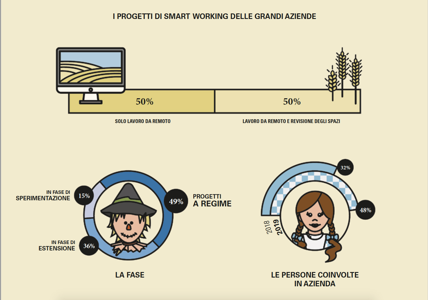 Nelle piccole e medie la diffusione delle iniziative di smart working cresce dall’8% di progetti strutturati del 2018 al 12% dell’anno dopo, ma si continua a prediligere l’approccio informale, che cresce dal 16% al 18%, anche in relazione alla minor complessità organizzativa.