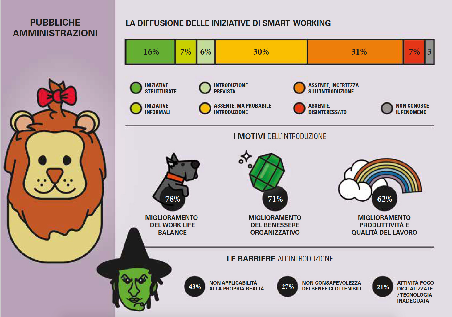 Il limitato livello di comprensione del pieno significato dello smart working in questo settore e la sua sostanziale associazione a un puro strumento di conciliazione – si precisa nella relazione che accompagna l’indagine degli Osservatori del Politecnico - si deduce anche dal fatto che la selezione delle persone da coinvolgere nel progetto è avvenuta considerando principalmente le esigenze familiari, come ad esempio i rientri dalla maternità (nel 70% degli enti locali) o la presenza di disabilità o familiari a carico (57%) e, solo in seconda battuta, tenendo conto delle caratteristiche delle attività svolte dalla persona (57%). Le barriere indicate sono invece la percezione che non sia applicabile alla propria realtà (43%), la mancanza di consapevolezza dei benefici ottenibili (27%) e la presenza di attività poco digitalizzate, vincolata all’utilizzo di documenti cartacei e alla tecnologia inadeguata (21%).