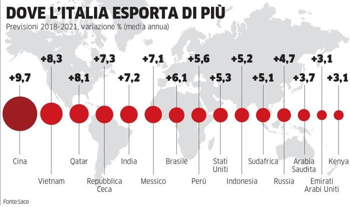 Le due regioni dove si è registrata la più significativa crescita dell’export italiano: l’Asia orientale e gli Usa, la prima destinataria del 27,9% del totale dell’export italiano, e la seconda del 13,2% del totale dell’export.