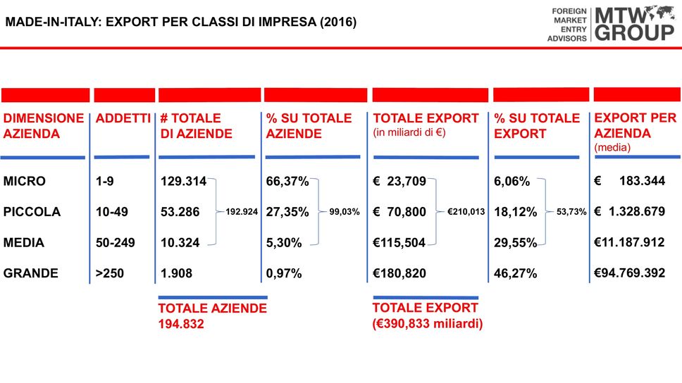 Salvo qualche eccezione, siamo lontanissimi da una logica aziendale strutturata per l’export, dal disegno di una strategia di market-entry e dall’utilizzo di adeguate tecniche di marketing da parte delle micro, piccole e medie imprese, ancora troppo legate a modelli di ricerca del new business ormai superati e desueti.