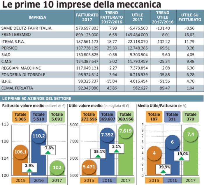 Intanto il dato di contrasto resta quello riferito alla leggera riduzione delle imprese meccaniche che figurano nell’elenco delle prime mille imprese della provincia. Tanto che il fatturato medio continua a salire. Risalta su questo andamento anche il valore dell’utile che, nonostante un minor giro d’affari delle 196 industrie, registra invece un aumento del suo valore: dai 490 milioni ai 509 milioni di fine 2017. Anche sui profitti la media per impresa sale, passando dai poco più di 2 milioni agli oltre 2,6 milioni di fine 2017.