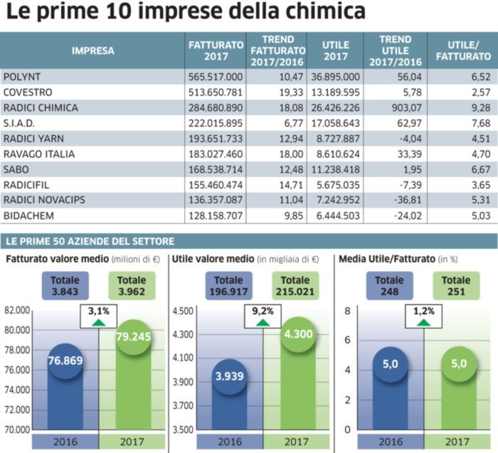 Così a fine 2017 le 56 industrie chimiche che figurano nelle prime migliori mille aziende del territorio per fatturato, complessivamente avevano realizzato il nuovo primato di poco oltre i 4 miliardi di euro, superiore di quasi il 5% rispetto ai 3,8 miliardi del 2016 ma soprattutto pari a più del doppio del valore del fatturato del periodo pre-crisi (fine 2008), quando il settore registrava 1,9 miliardi di ricavi.