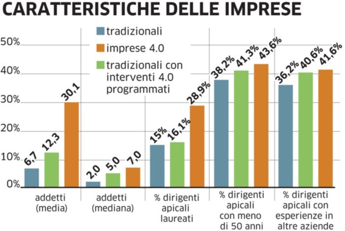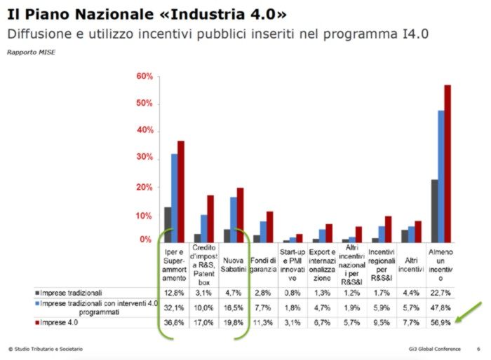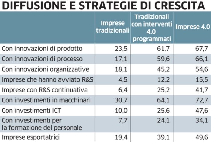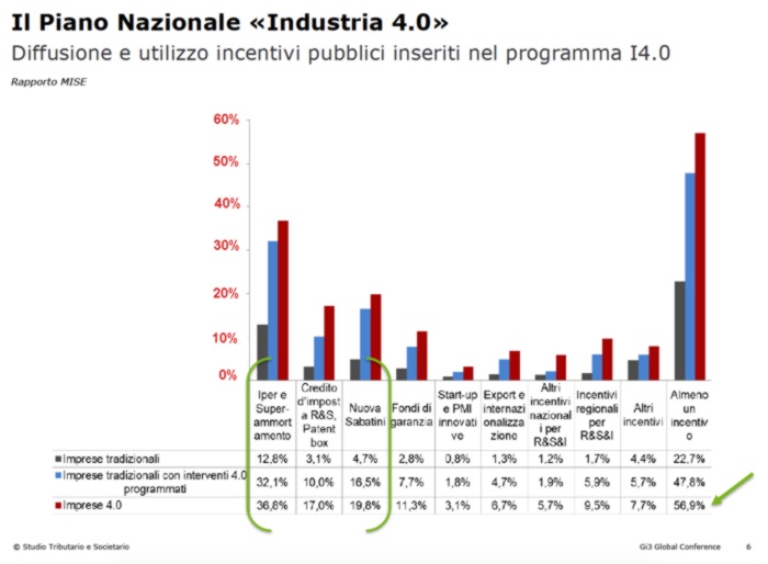 Il 56,9% delle imprese 4.0 infatti ha dichiarato di aver utilizzato almeno un incentivo: esse hanno utilizzato in larga prevalenza il super-ammortamento e l’iper-ammortamento, il 36,8% nel caso delle imprese 4.0 e 12,8% tra quelle tradizionali. Il credito d’imposta per le spese in R&S (17,0% e 3,1%), la Nuova Sabatini (19,8% e 4,7%) e i fondi di garanzia (11,3% e 2,8%)».