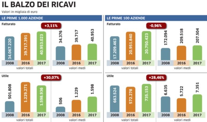 L’utile è quintuplicato nell’arco degli ultimi dieci anni, dai 22 milioni del 2008 ai 113 del 2016, ma balzando ancora a un ulteriore 136 milioni di fine 2017. È leggermente cresciuta anche la media dell’utile per azienda, da 1,64 milioni del 2016 ai quasi 2 milioni del 2017.