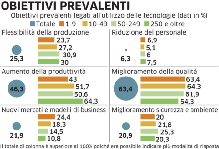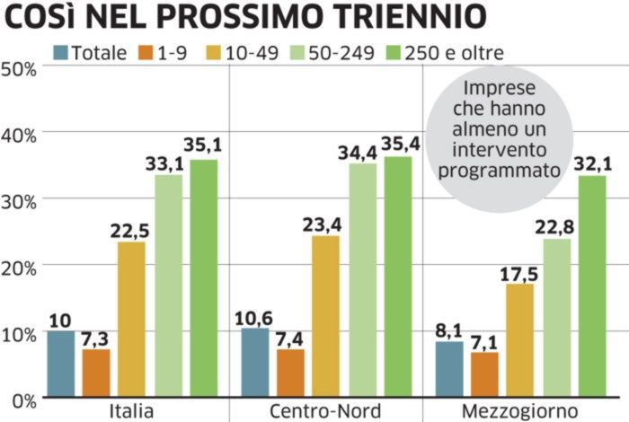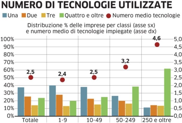 Interessante anche il segmento di società con un elevato numero di programmi futuri: sul 10% complessivo di imprese con interventi futuri, il 3,7% prevede di implementare quattro o più tecnologie 4.0, oltre la metà (5,5%) almeno tre. Se si considerano le imprese con più di 50 addetti, una su cinque interverrà su almeno tre tecnologie.