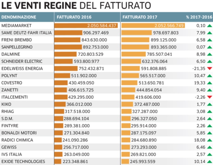 Ecco allora la classifica 2017: sul gradino più alto del podio 2017 anche quest’anno, quindi, si conferma regina dei migliori bilanci per fatturato Mediamarket, industria leader nel commercio di prodotti elettronici con ricavi di poco sopra i 2 miliardi di euro. Segue poi Same, Brembo, Sanpellegrino, Dalmine, Schneider Electric, ma anche Polynt, Italcementi, Radic e Gewiss sono le industrie fra le prime venti regine del fatturato bergamasco 2017 (con valori dei ricavi fra i 2 miliardi di euro e i 300 milioni di euro), tutte in crescita, e confermate imprese trainanti di un sistema in grande trasformazione produttiva sotto la spinta del paradigma digitale di Industria 4.0 ora rinominata Impresa 4.0.
