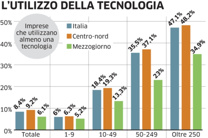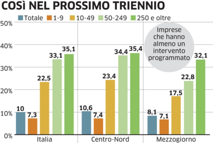 Le imprese “tradizionali”, ovvero che invece non utilizzano tecnologie 4.0 né hanno in programma interventi futuri sono all’86,9% del totale. Ma queste imprese rivelano anche, in proiezione futura, che non potranno che caratterizzarsi per una crescente propensione verso la digitalizzazione dei processi produttivi: al 4,7% delle aziende che hanno in programma almeno un intervento nei prossimi tre anni, si aggiunge un gruppo particolarmente accentuato di piccole (9,4%) e di medie imprese (8,2%).