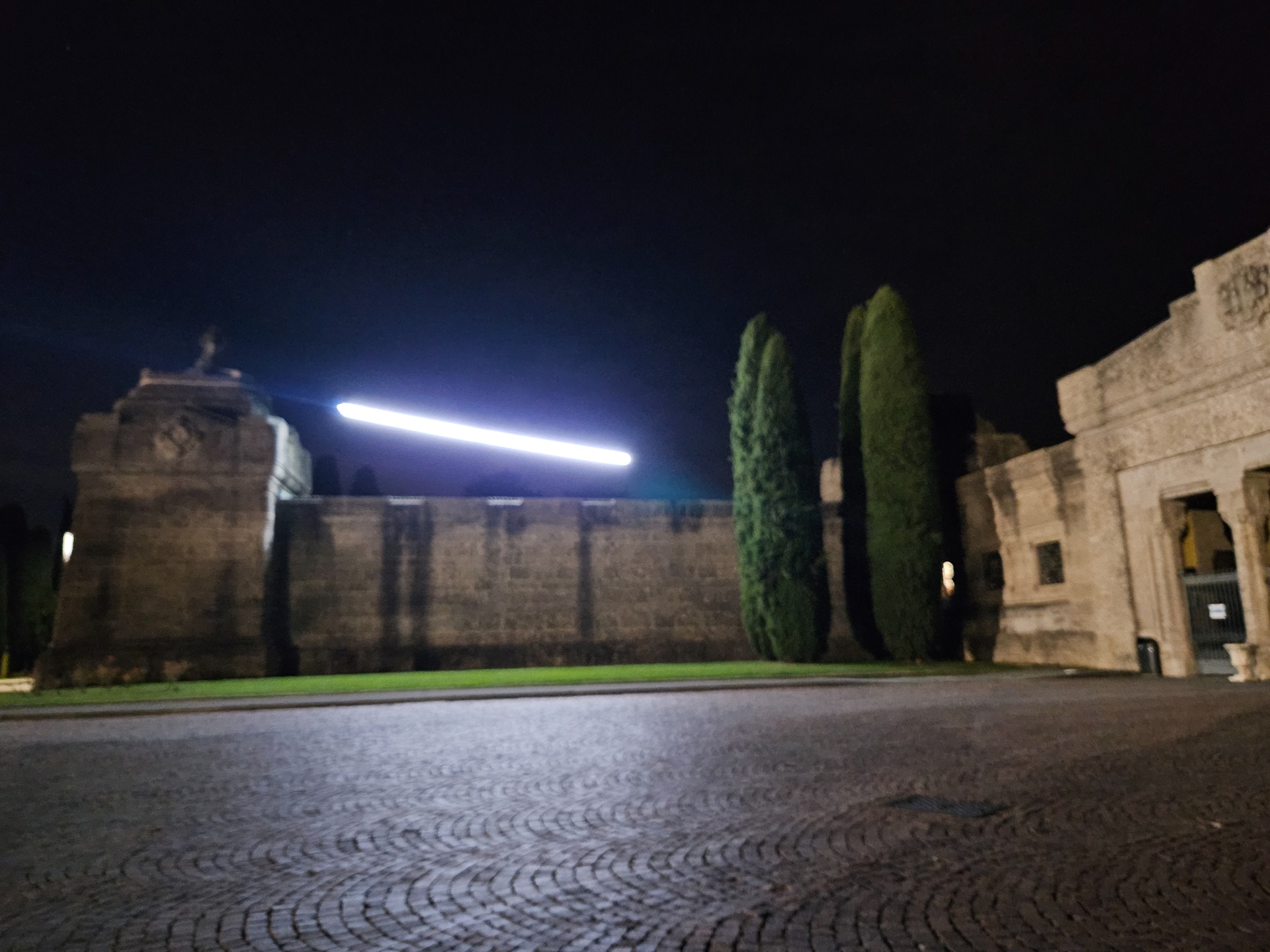 Sul lato sinistro dell’ingresso, Nadia Antonelli e Paolo Ghezzi presentano Shooting Stars, un’installazione che collega il cimitero al cielo: un cavo luminoso si accende ogni volta che una stella cadente attraversa il bacino del Mediterraneo, grazie ai dati del radiotelescopio di Medicina (Bologna).