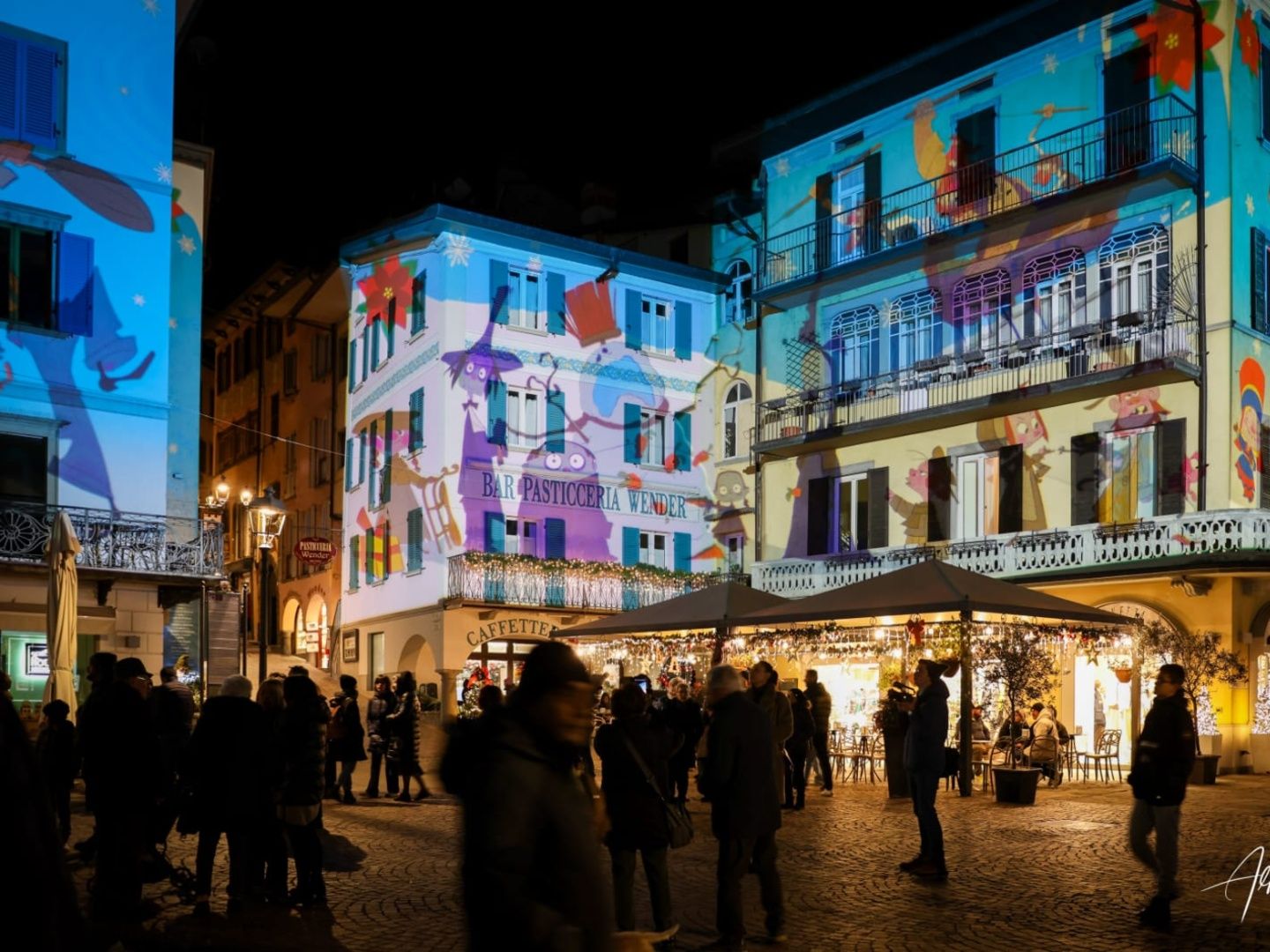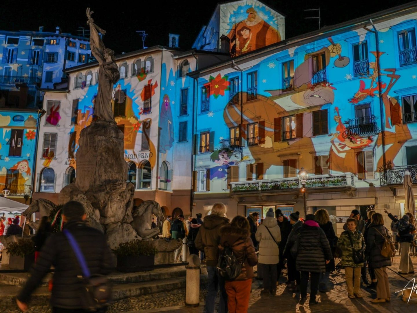 LA MANIFESTAZIONE. Accese le lampade che fino all’Epifania proietteranno sui palazzi del lungolago e del centro storico le immagini del disegnatore tedesco Torsten Schrank e le illustrazioni dell’artista Gloria Verni.