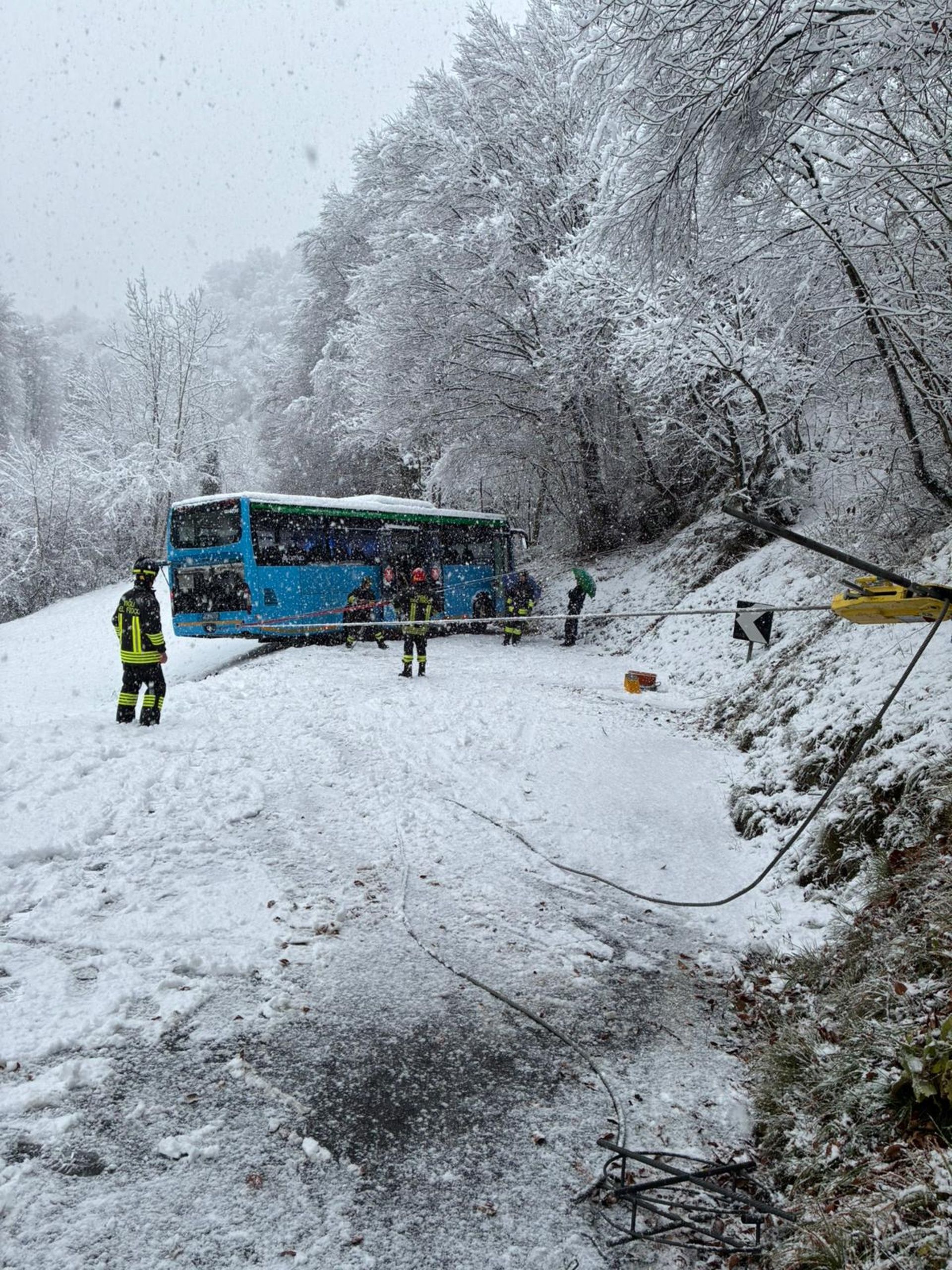 Valle Serina, autobus di traverso. Studenti a piedi, strada bloccata - Foto