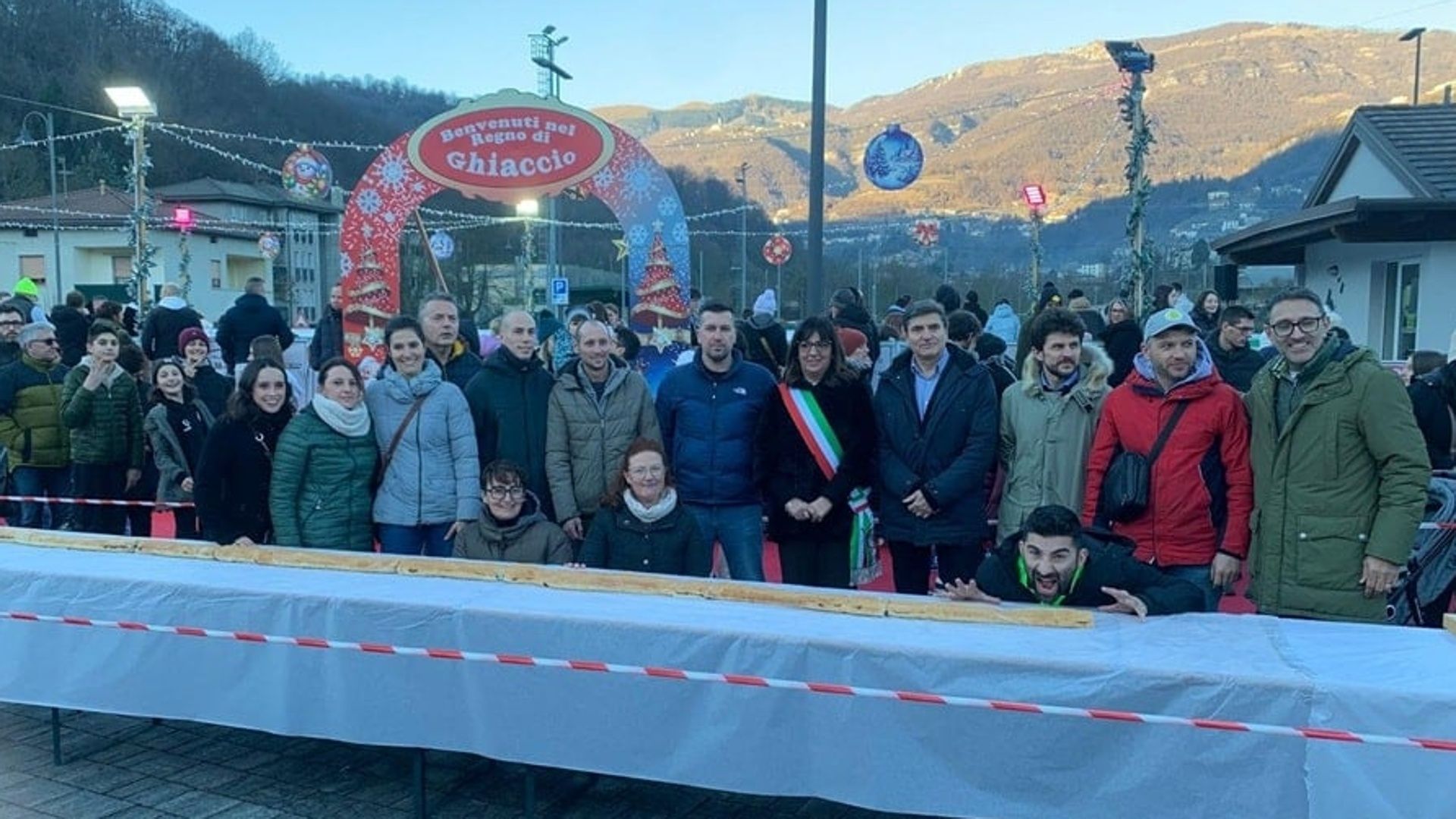 Continuano con successo gli appuntamenti natalizi promossi dall’associazione commercianti E-20 in piazza Nani Frosio a Sant’Omobono Terme. Tra i momenti più originali, quello di sabato scorso, quando è stata presentata al pubblico una baguette da record, lunga circa venti metri e interamente farcita di Nutella che poi è stata tagliata e distribuita ai presenti per la merenda.