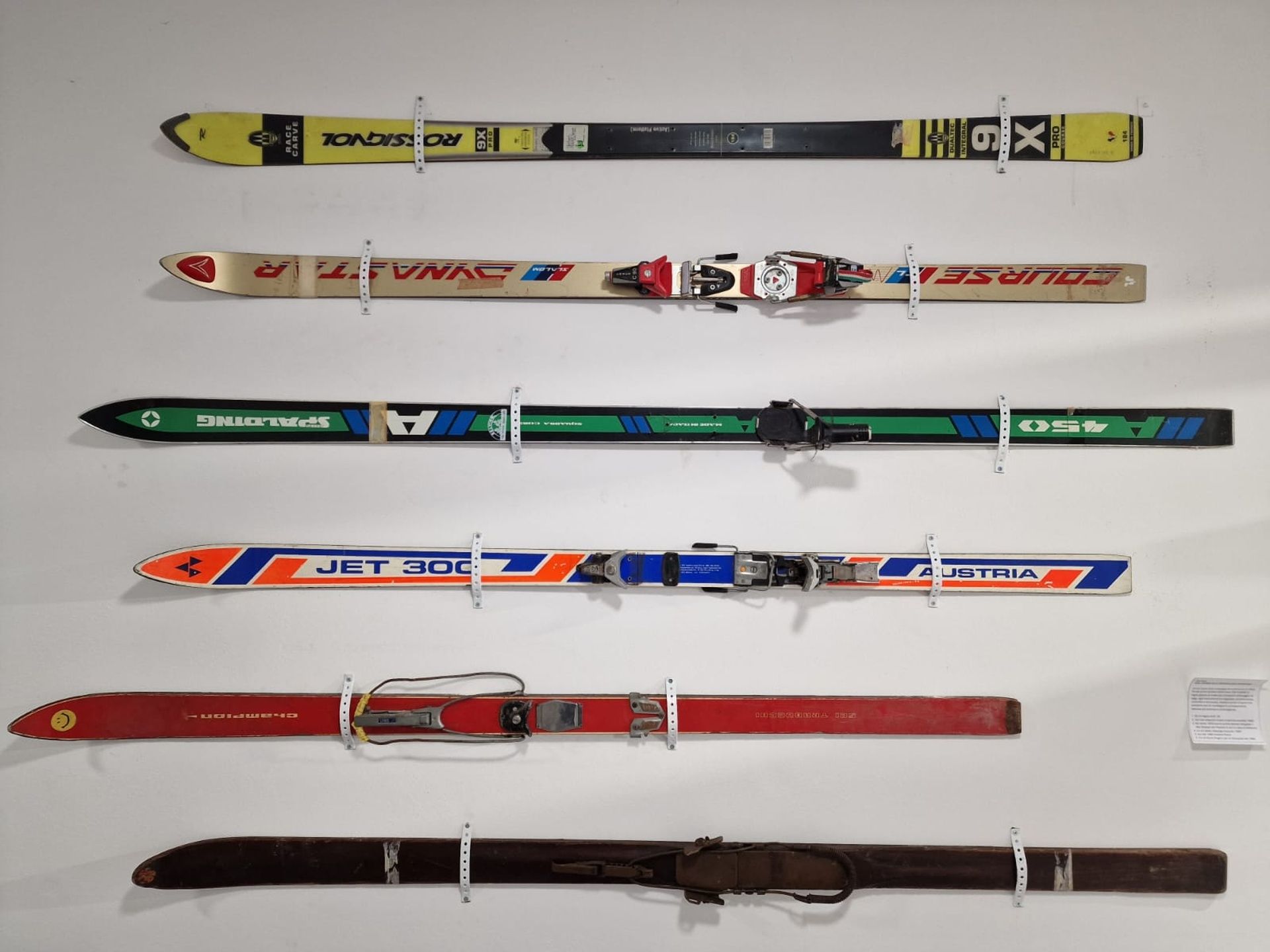 Il cuore della Mostra museo è un percorso espositivo che ripercorre l’intera evoluzione dell’attrezzatura da sci: si parte da sci in legno lavorati artigianalmente, scarponi di cuoio e attacchi rudimentali, fino ad arrivare ai materiali di oggi, con foto d’epoca e pannelli illustrativi ad accompagnarli.