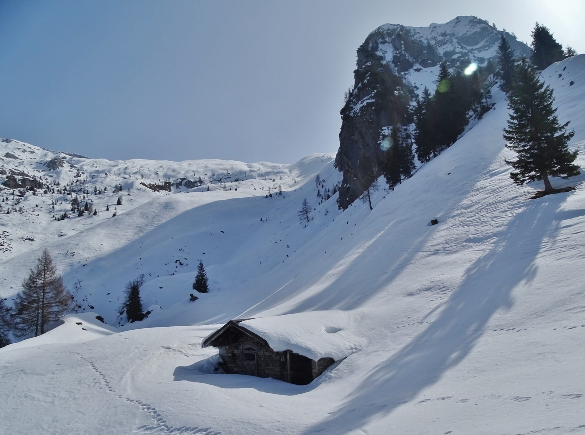 Nella giornata di sabato 7 marzo lo spessore del manto nevoso (ormai assestato), nell’area pianeggiante all’esterno della baita, era di una sessantina di centimetri contro i 90 dello scorso anno e i 120 centimetri del 2024.