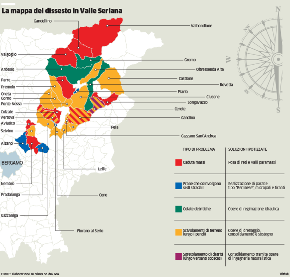 Da quasi un anno lo Studio Gea di Ranica, che vanta oltre mezzo secolo di esperienza sul territorio, è al lavoro in Valle Seriana per verificare, di concerto con gli uffici tecnici dei 38 Comuni, i vari problemi di dissesto, per mapparli, organizzarli secondo la tipologia di intervento necessario per la loro messa in sicurezza e ordinarli in base a una scala di priorità: dai più ai meno critici. «Abbiamo individuato quaranta frane – spiega Sergio Ghilardi, geologo dello Studio Gea –, ma non su tutti i Comuni». Stava infatti a ogni municipio segnalare le criticità geologiche ritenute prioritarie «sulla base della loro interferenza con le infrastrutture e/o con il tessuto urbano –, precisa l’esperto – Quasi tutti i Comuni hanno segnalato gli eventi ritenuti più significativi e noi ci siamo adoperati per eseguire i sopralluoghi necessari per una valutazione critica della situazione geologica e dei fattori di rischio e pericolosità, in modo da scegliere quelli ritenuti più significativi».