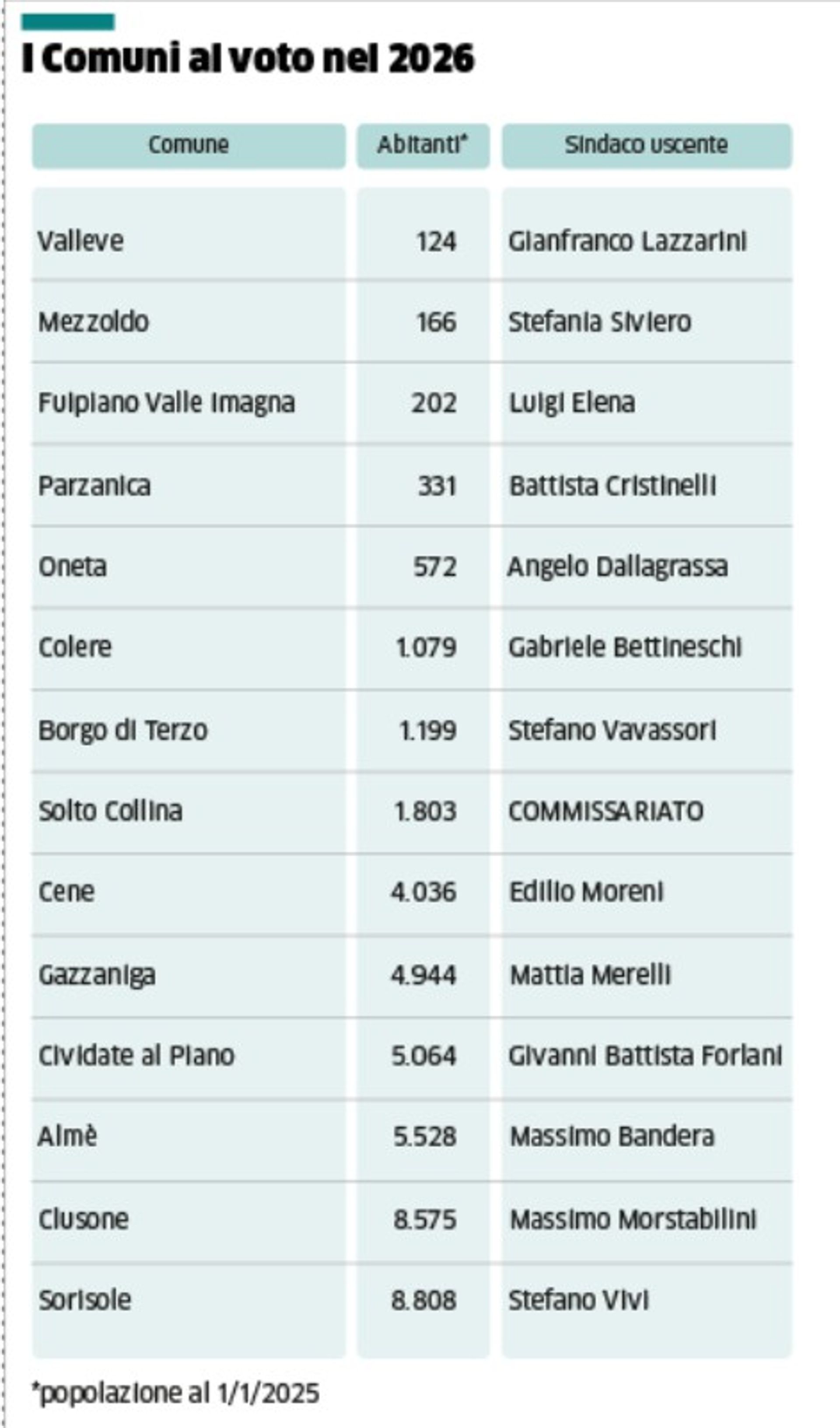Si potrebbe soprannominare la tornata dei «piccoli»: nei Comuni interessati la popolazione coinvolta tocca i 42mila abitanti. Il Comune più popoloso è Sorisole, con circa 8.800 residenti, mentre a Valleve vivono poco più di un centinaio di anime. Questa tornata si inserisce d’altra parte nel più ampio panorama elettorale della Bergamasca: nel 2026 sarà il tempo anche per l’elezione del nuovo presidente della Provincia e per il rinnovo del Consiglio provinciale (in questi due casi a votare sono sindaci e consiglieri comunali). In un quadro, tra l’altro, in cui il centrodestra ha annunciato di voler correre unito dappertutto: insomma, le Amministrative che si terranno tra pochi mesi saranno una prima prova generale del nuovo assetto politico provinciale. Ecco le prime indiscrezioni.