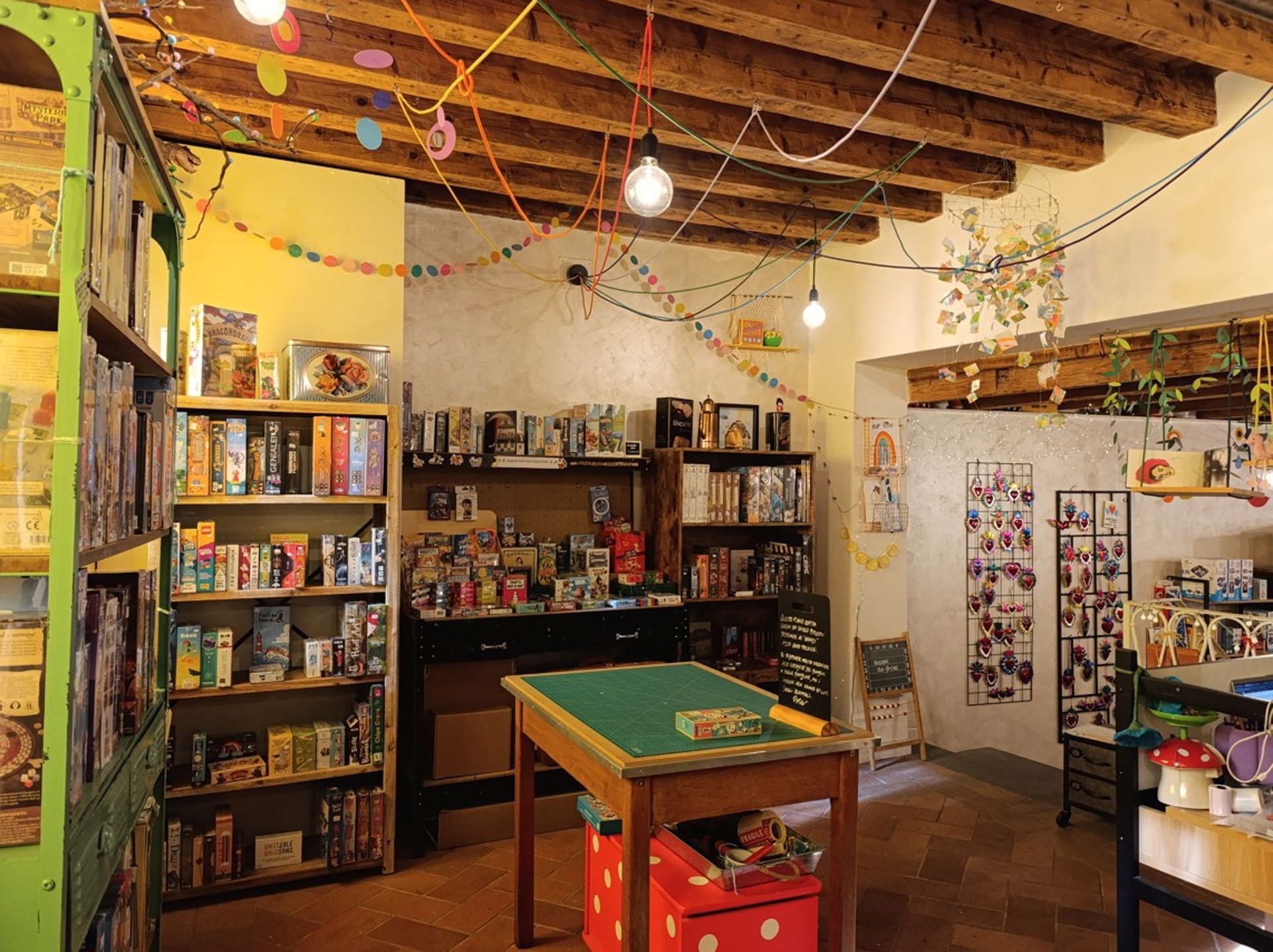 Spinto dalla curiosità di capire cosa potesse riservare Clusone ad un giocatore da tavolo, mi sono avventurato per le sue vie in un fresco lunedì di fine ottobre. Arrivato al negozio, ho trovato ad accogliermi la proprietaria – o come si definisce lei «timoniera» – Sara Savoldelli. Tempo di un breve saluto e, nell’attesa che Sara finisse di sistemare un paio di cose, ho cominciato a vagare per quello che esteticamente credo sia uno dei negozi visivamente più «belli» che abbia mai visto. Travi in legno, luci e piante che circondano scaffalature cariche di giochi da tavolo in un mix tra lo stile shabby chic e l’interno di una casa degli gnomi di un libro illustrato per bambini. Proprio sul paragone scopro di averci preso non appena ho cominciato a chiacchierare con Sara.